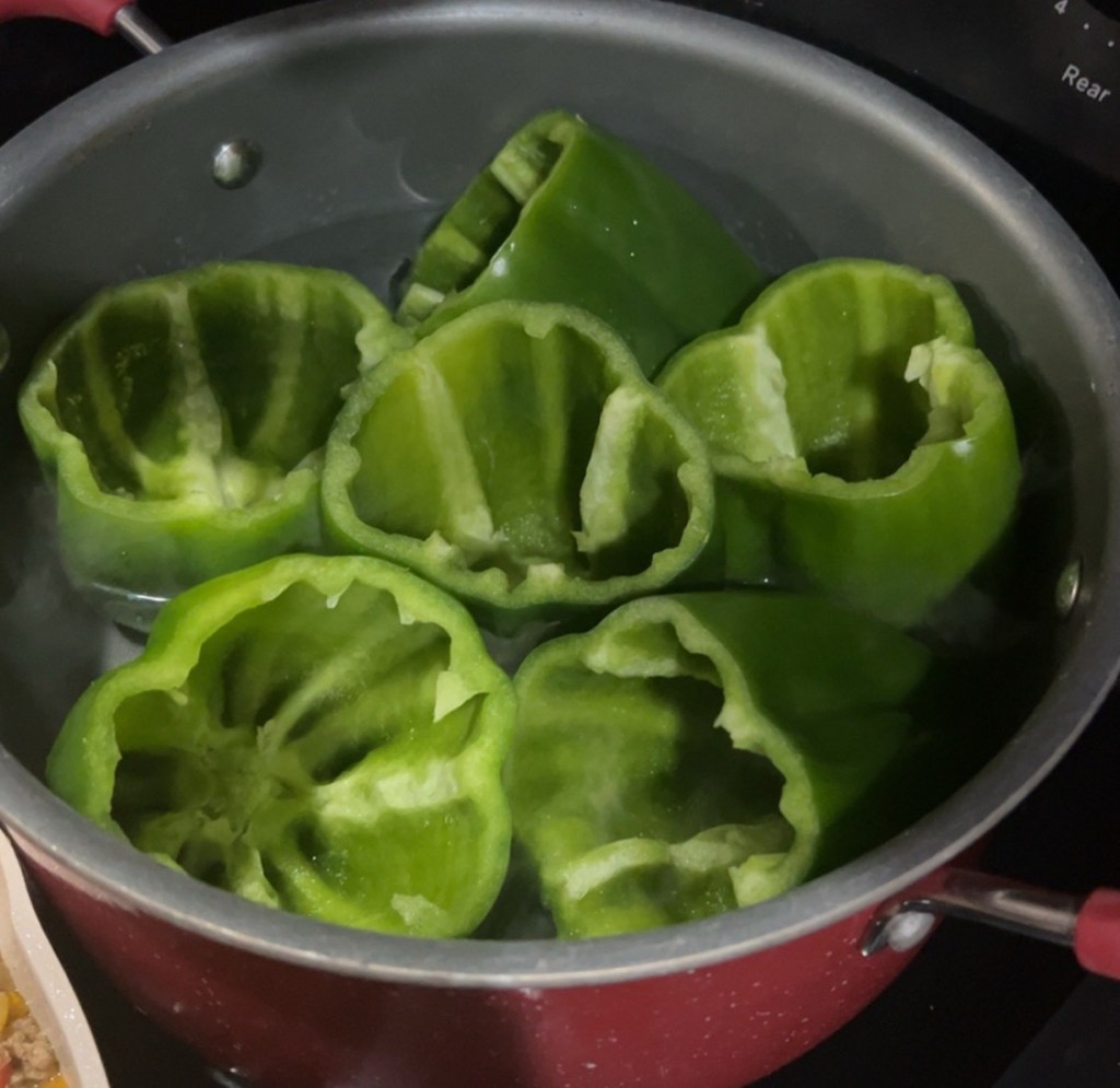 - Prep the stuffing peppers: Slice off the tops of 4 bell peppers and remove the seeds and membranes. Set the caps aside if you want to use them for presentation. (We boiled our peppers so that they would be the right softness that we liked.)